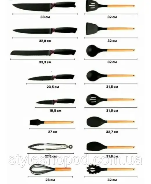 - Ножі (універсальний, шеф-ніж, ніж для овочів, ніж для хліба, ніж для філе), довжина ножів від19,5 до 33 см.